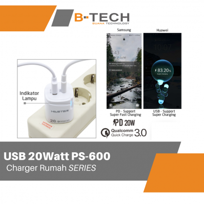 Pengisi daya / charger rumah untuk mengisi daya gadget.Dilengkapi dengan pengisian cepat menggunakan teknologi komponen Qualcomm 3.0 dan support PD (tergantung fiturnya).