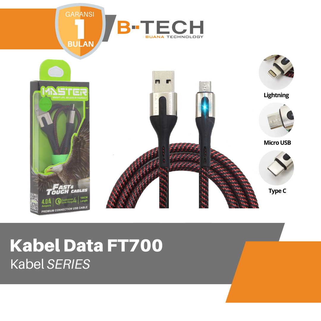 Kabel Data LED Fast Charging 4A Type C PD Micro USB iOS Lightning Android 1M MASTER FT700 Garansi 30 Hari