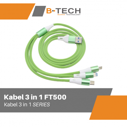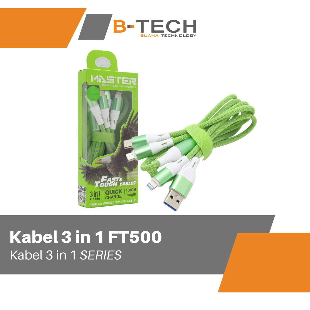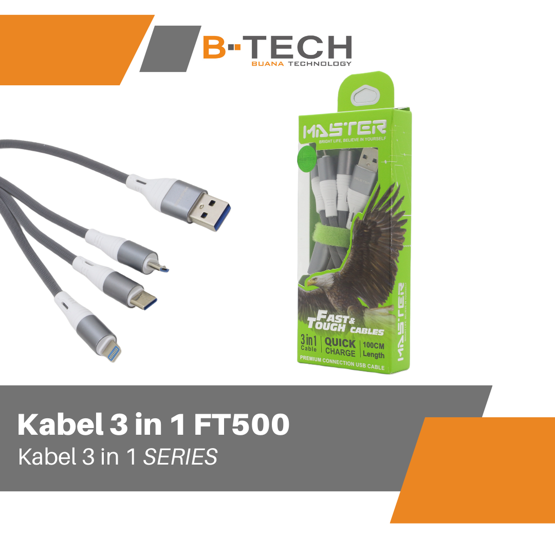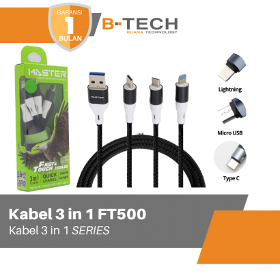 Kabel Data 3 in 1 Fast Charging Kabel 1.2Meter HP Tipe C Micro iOS Lightning MASTER FT500 Garansi 30 Hari